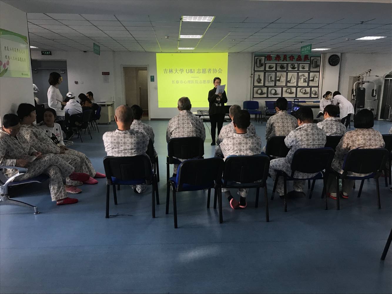 首先,志愿者们演唱了《那些花儿》、《明天你好》等歌曲,并为患者们编排了体操,使其进行适当运动,锻炼身体。接下来,志愿者们开展了英语小课堂的公益授课项目,教授简单的英语日常用语,使患者们拓展视野,学习新知识。活动结束后,一位女患者说:“我很喜欢你们的活动,感谢你们来帮助我们。我最近在学习俄语,希望下次能听到你们演唱俄语歌曲《喀秋莎》。”患者们对于此次活动的肯定让志愿者们感到满足与欣慰。