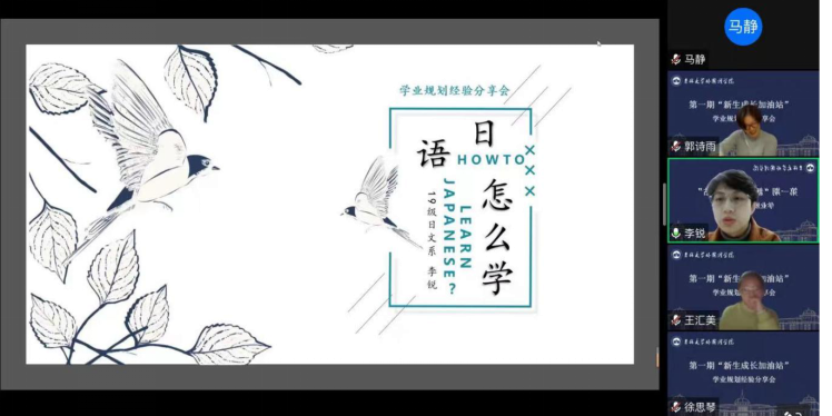 2020级英文系刘骥同学主持,2019级英文系徐焱冰、2019级俄文系马静、2019级日文系李锐、2019级西文系徐政奇、2019级朝文系李涵做学习经验分享。2022级学生辅导员刘宇老师、学院2022级新生参加。