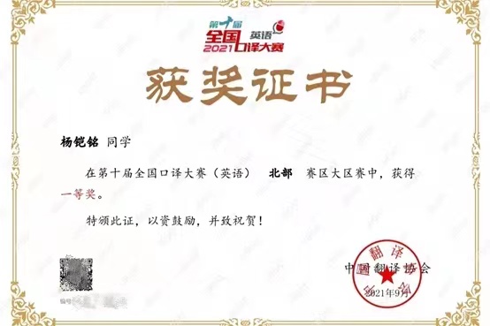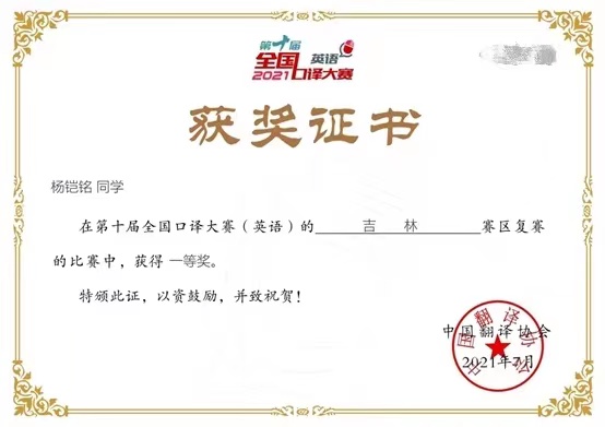 全国口译大赛是在中国外文局指导下,由中国翻译协会主办的历史最悠久、规模最大、含金量最高的口译赛事之一。大赛遵循我国深化改革开放的大政方针和为国家选拔和输送实用型外语人才的目标,精心设计赛题,全面考察选手综合能力,真实展现选手语言应用能力。2021全国口译大赛吸引了全国几乎所有高校以及包括来自美国、英国、比利时、新加坡等海外院校选手的积极参与。期待杨铠铭同学亮相总决赛彰显吉大学子风采与实力!